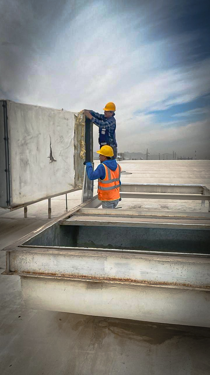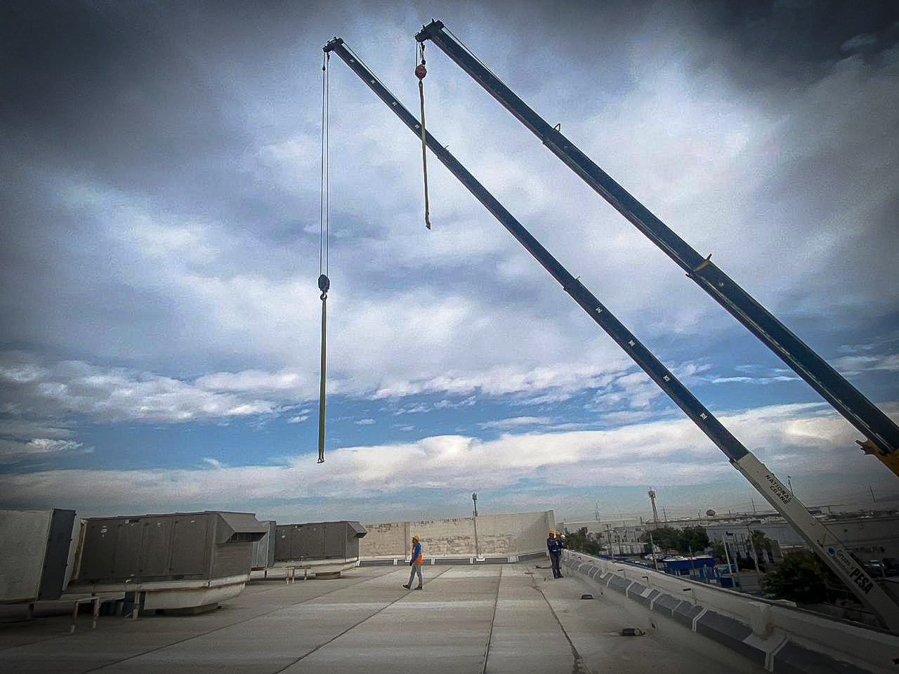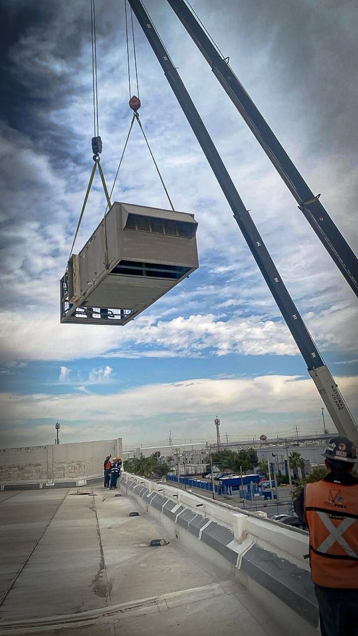 Retiro y remplazo de Unidades Paquete de refrigeración para Cuarto Limpio de calidad en planta MGS, el proyecto consta del remplazo de 3 Unidades Paquete de 30TON modelo Millenium por 3 Unidades paquete de modelo reciente más eficientes con el fin de mejorar la presión al interior del cuarto, cumplir con el caudal de aire requerido, cambios de aire, temperatura y control de partículas de aire. El trabajo comprende de las maniobras por medio de grúa TITÁN para retirar equipos existentes y colocar los nuevos posterior a las modificaciones de la base existente por medio de estructura metálica, interconexión de ducterías y bancos de filtros, instalación eléctrica nueva, toma de parámetros, instalación de descargas pluviales, aislamiento de ductos y arranques de equipos.